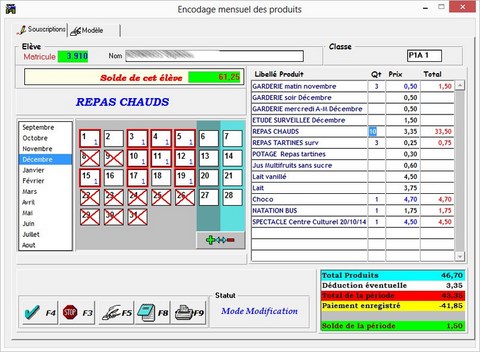 Gérer efficacement votre cuisine et vos approvisionnements en connaissant à chaque moment le nombre précis de repas, produits et services divers : de façon mensuelle, hebdomadaire ou quotidienne, par classe et par période, la distribution pour chaque élève étant détaillée dans une fiche spécifique...